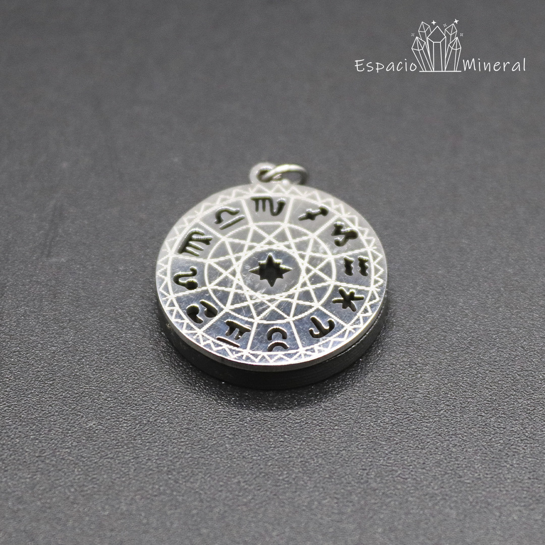Este colgante combina acero y shungit creando un elegante y bonito contraste. El shungit es una piedra excelente para protección contra las radiaciones electromagnéticas. Este diseño incluye los 12 signos del zodiaco montados en acero con shungit.