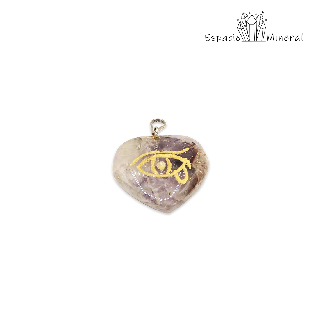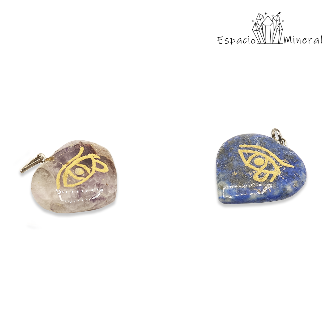 Colgante pulido en forma de corazón disponible en Lapislázuli y Amatista. Tiene grabado el símbolo egipcio del ojo de horus, que es usado desde la antigüedad contra las energías negativas y el mal de ojo.