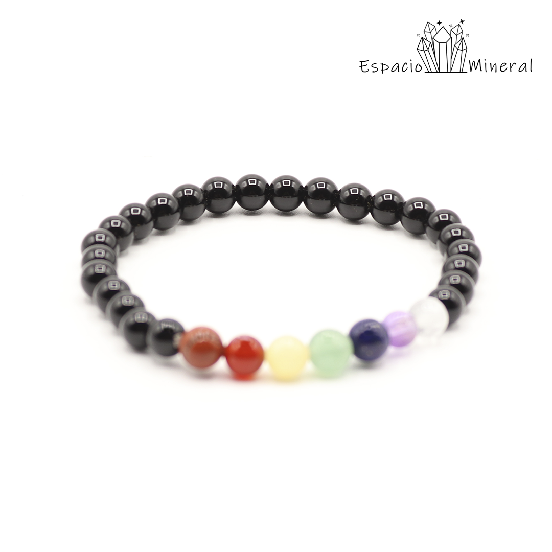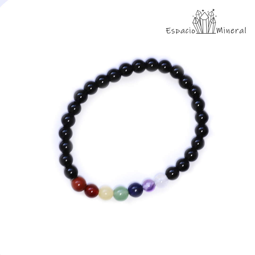 Una pulsera excepcional, compuesta por las 7 piedras de los chakras, acompañadas de una de las protectoras por excelencia, la obsidiana negra.